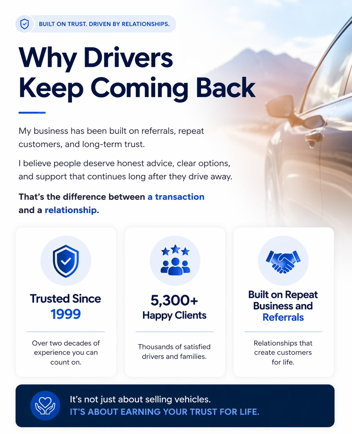 My business has been built on referrals, repeat customers, and long-term trust. I believe people deserve honest advice, clear options, and support that continues long after they drive away. That’s the difference between a transaction and a relationship.