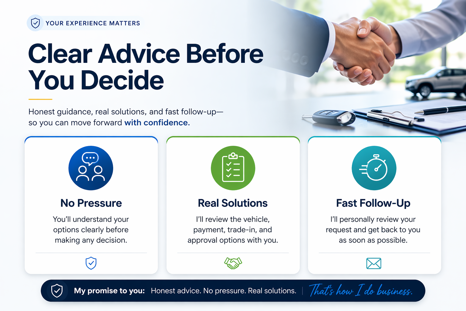 Tell me a little about your situation, your current vehicle, and what you’re hoping to achieve. I’ll help you find the best path forward.